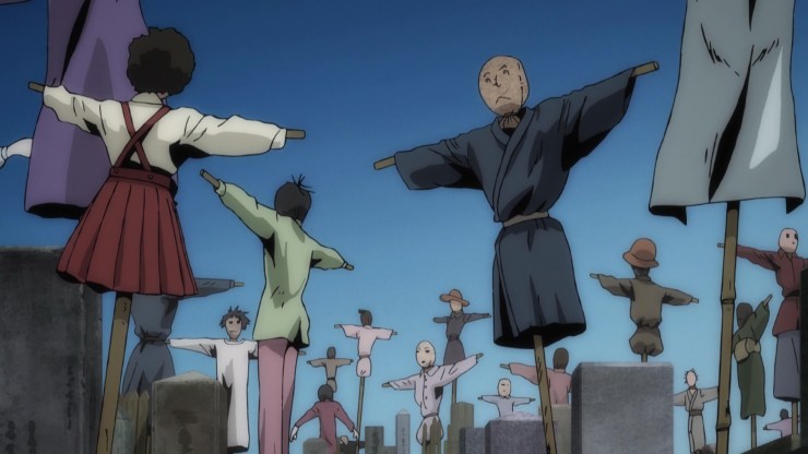 Like the manga short it’s based on, the anime adaptation seen in Junji Itō Collection focuses on several bereaved people visiting their dearly departed loved ones’ graves in a rural village. Other mourners follow suit when a father erects a scarecrow above his late daughter’s gravesite. The figures begin to change in appearance over time; they inexplicably take on the faces of the deceased. The weirdness does not end there as the scarecrows now carry out the wishes of all the souls they embody.