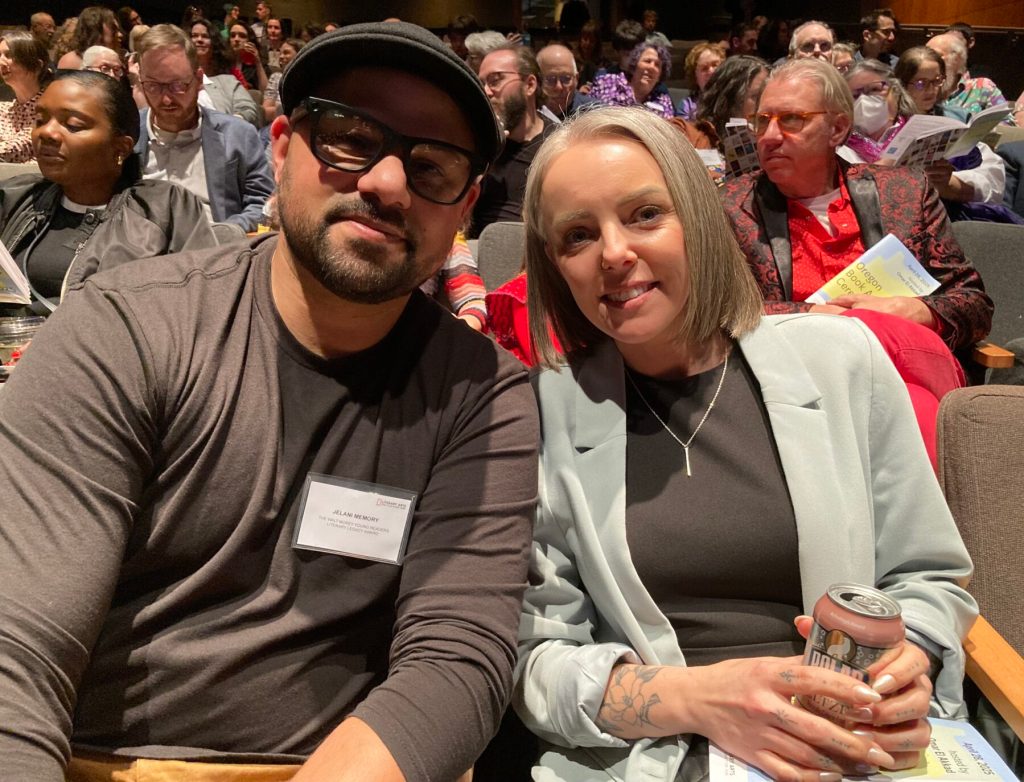 Jelani Memory and his wife, Brandy Memory, await the start of Monday night’s Oregon Book Awards ceremony. Memory was honored with the Walt Morey Young Readers Literary Legacy Award. Photo by: Amy Wang