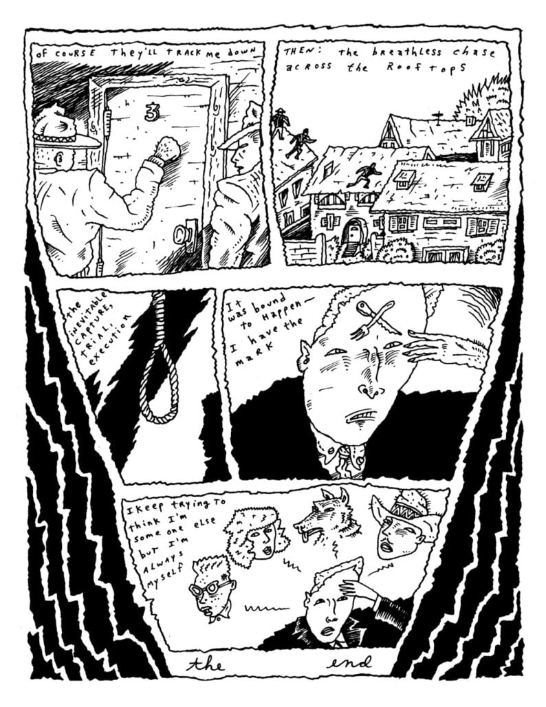 I found turning the pages of Night Drive to be a similar experience to attending the exhibition. It’s the type of work that will have you lingering over each page, and immediately starting from the beginning, awash with feeling and seeking to intellectualize bits of it. There are panels that pay homage to Universal Monsters The Invisible Man, inserted organically into strips that use horror noir to contemplate the nature of paranoia.
