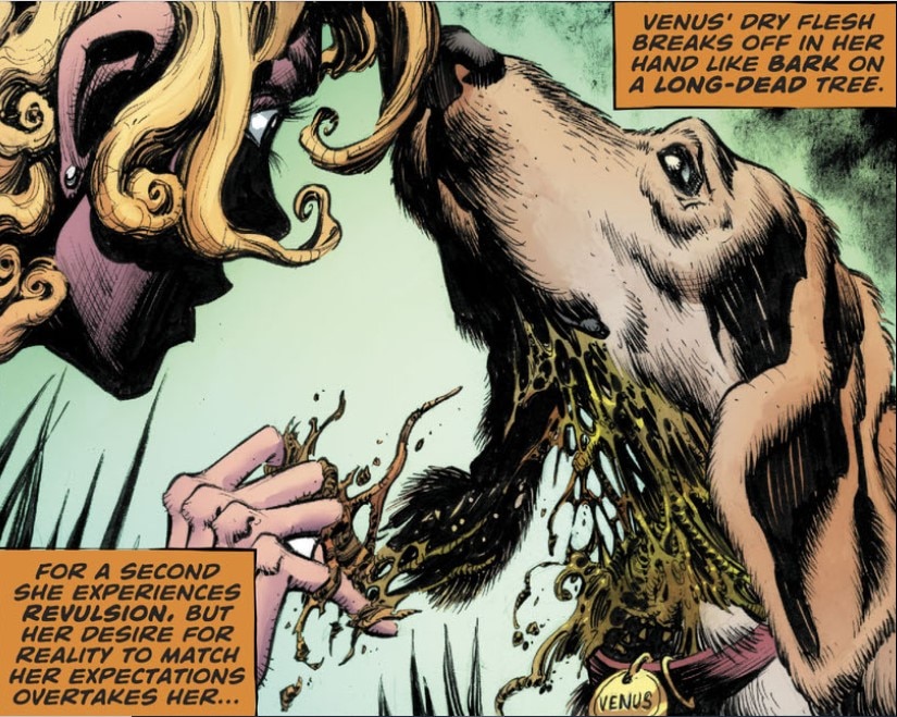 Is a DC horror collection really complete without a Swamp Thing story? “The Spread” may not have the most frightening premise, but its viscerally evocative art purely conveys the terror of being a child lost in the unforgiving woods. Plants don’t seem so scary, until they become all that surrounds you and the realization sinks in that you’re outnumbered by the physically imposing Green that can make one feel so hopelessly small. Be kind to the trees, Swamp Thing warns, or they may not be so kind to you.